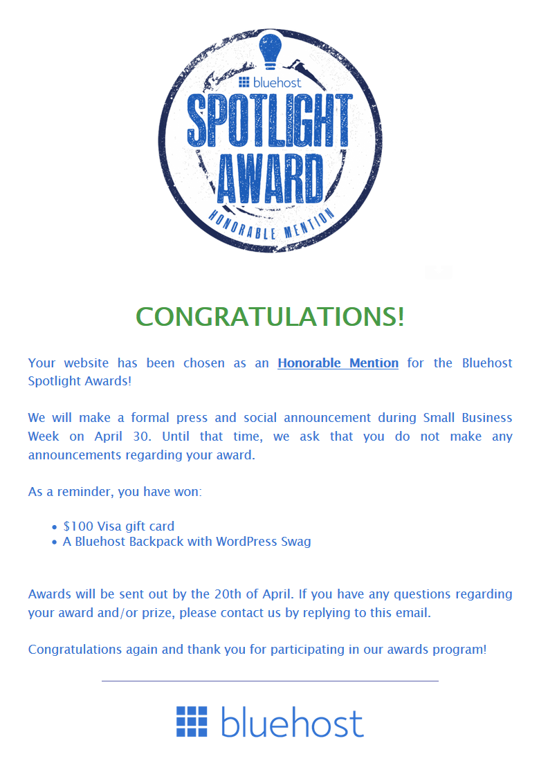 I won this honorable mention and associated prizes in 2018 when I entered my freelance Isaiah Design Co. business website into their competition! Bluehost has always been my website host, so when I received the email above, I was humbled and thrilled.
